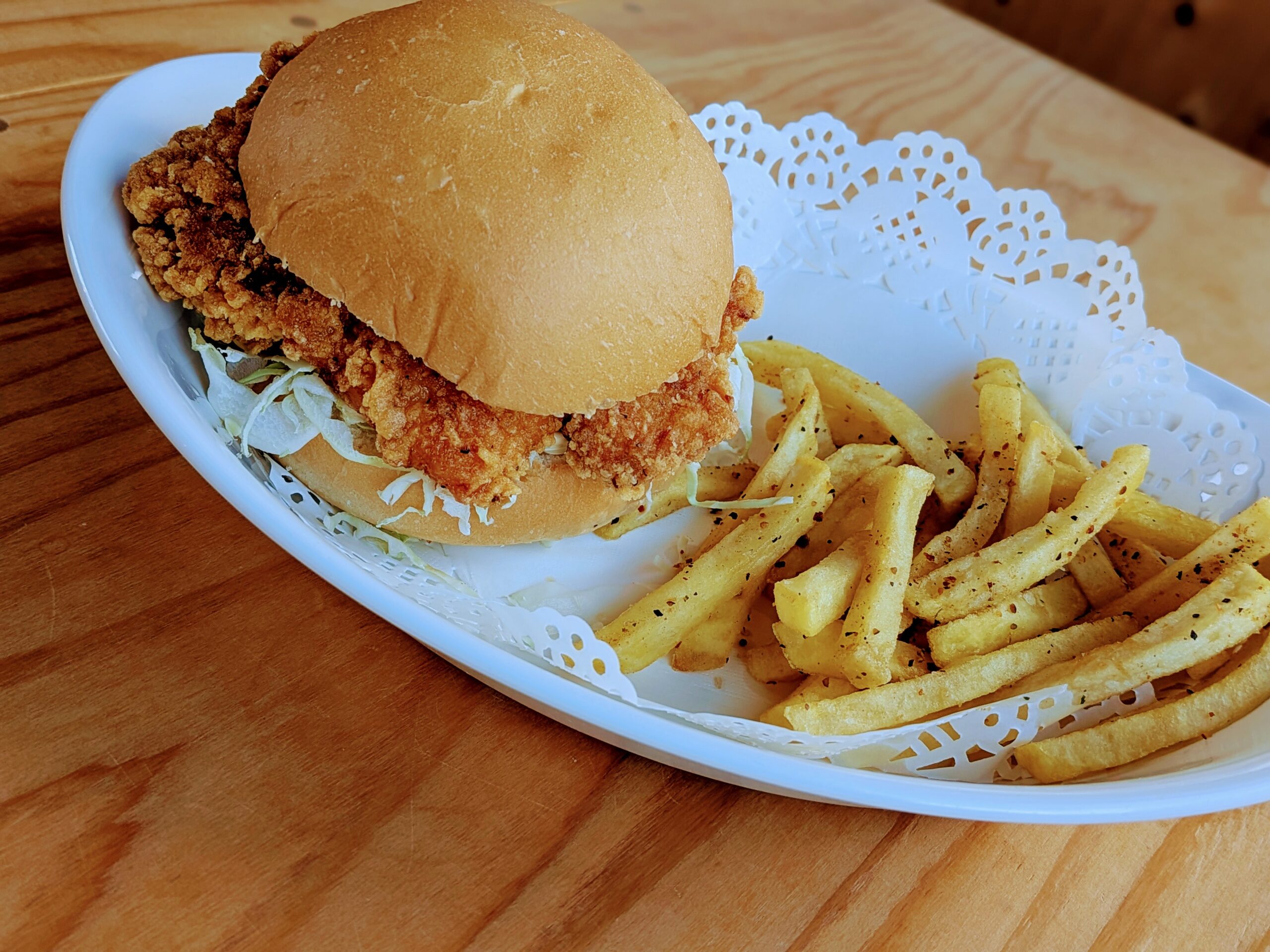 こんにちは! ユリアッティーです笑 今回は、IWADOBASEカフェで提供しているチキンフィレバーガーセットをご紹介✨️