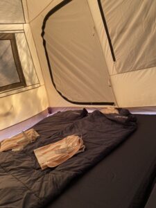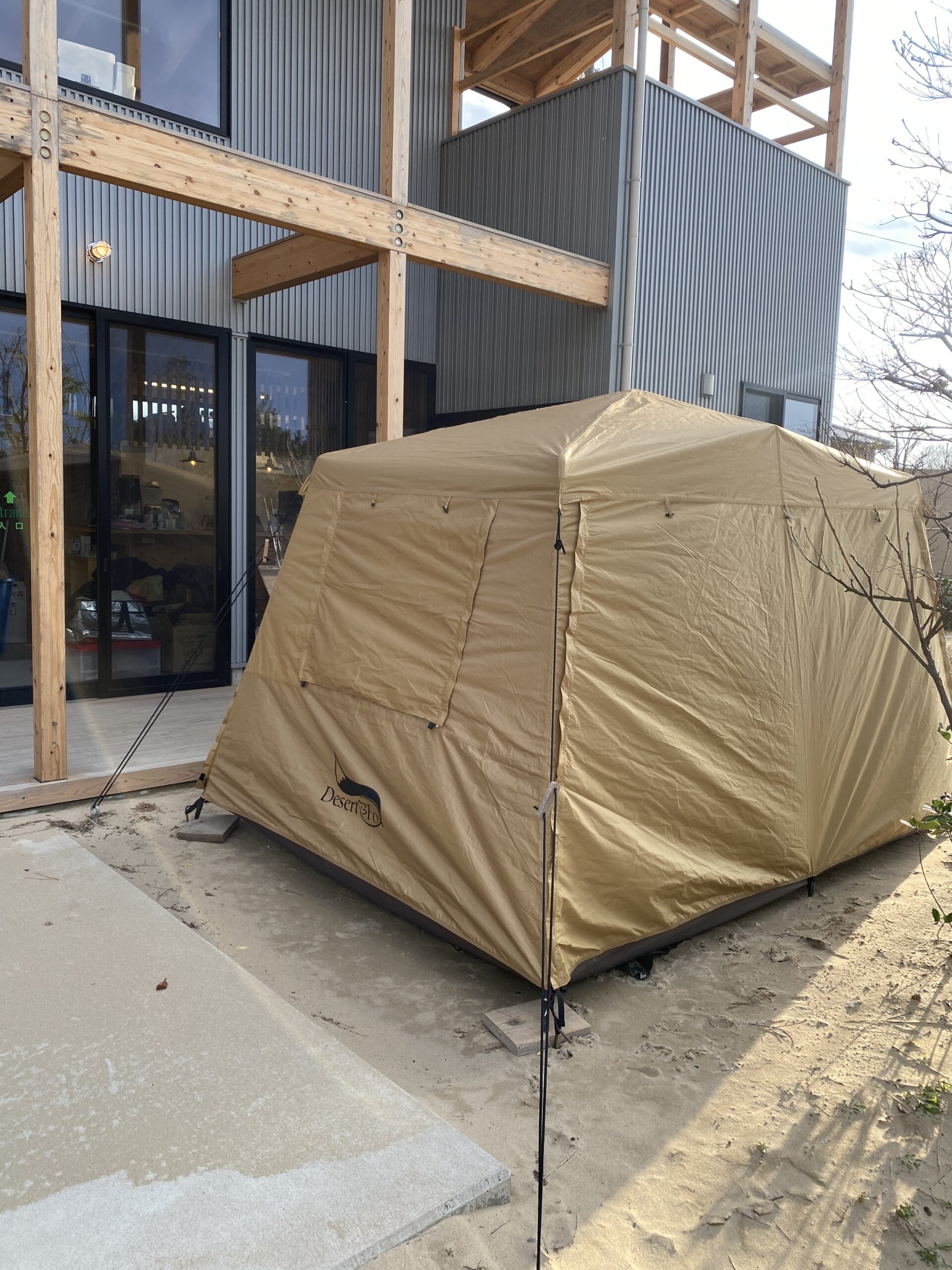 ありがたいことに、本日もキャンプのご予約が入っております。 少しでも風の影響を軽減し、快適に過ごしていただくために、お店のすぐ前にテントを張りました⛺️